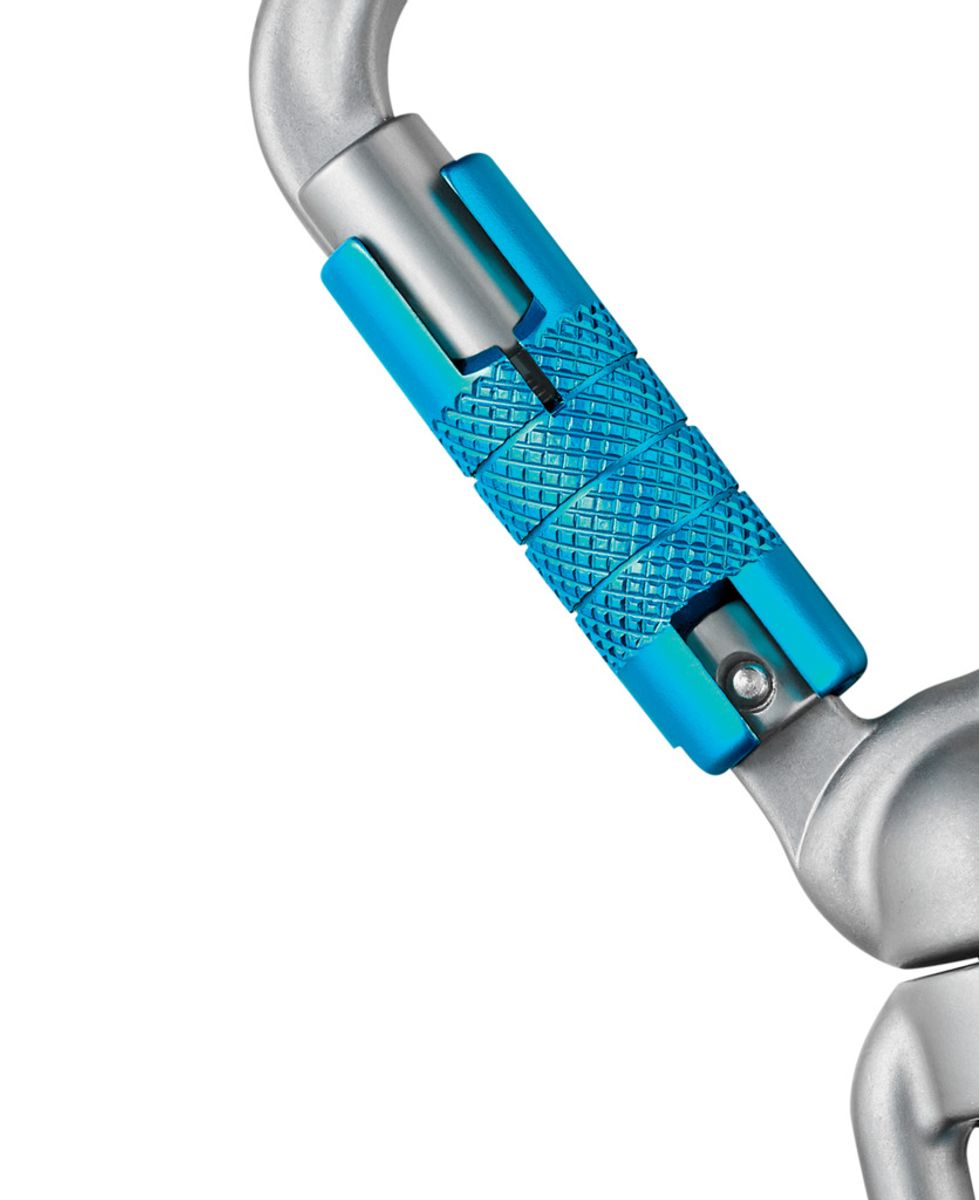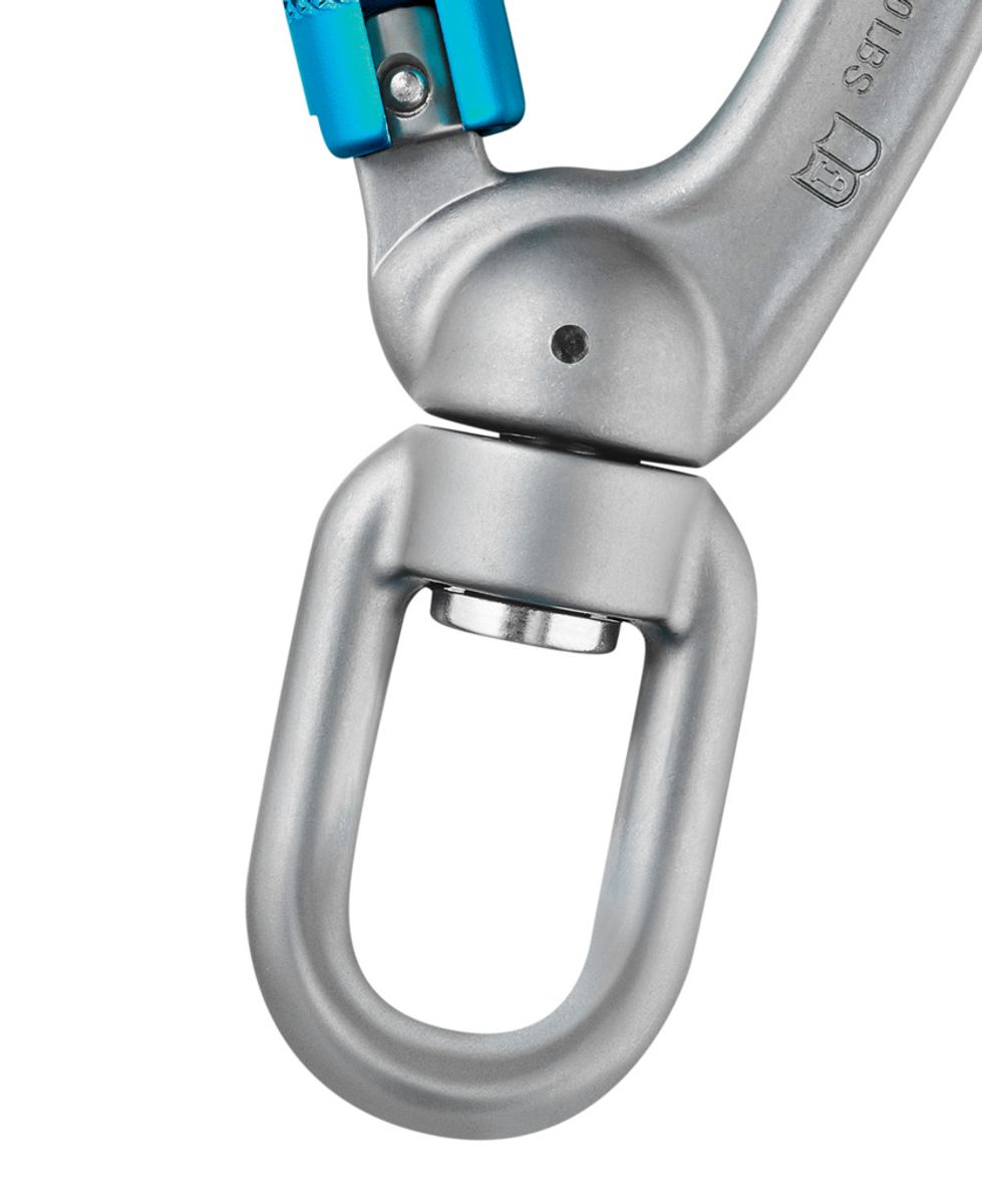 Der integrierte Wirbel verhindert effektiv das Verdrehen des Verbindungsmittels und sorgt so für mehr Sicherheit und Komfort bei längerem Einsatz. Der Karabiner verfügt über einen Triple-Lock-Verschluss, der ein versehentliches Öffnen nahezu ausschließt und ein zusätzliches Plus an Sicherheit bietet.
