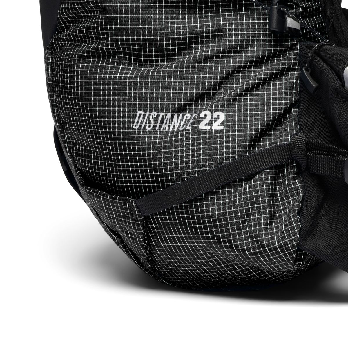 Der Distance 22 bietet ein großes Frontfach aus Stretchgewebe, zwei seitliche Staufächer, zwei Reißverschlussfächer und zwei Fächer speziell für Trinkblasen oder Soft Flasks (Soft Flasks nicht im Lieferumfang enthalten). Zusätzlich gibt es zwei elastische Fächer an den Schulterträgern sowie ein internes Reißverschlussfach mit Schlüsselclip für wichtige Kleinteile.