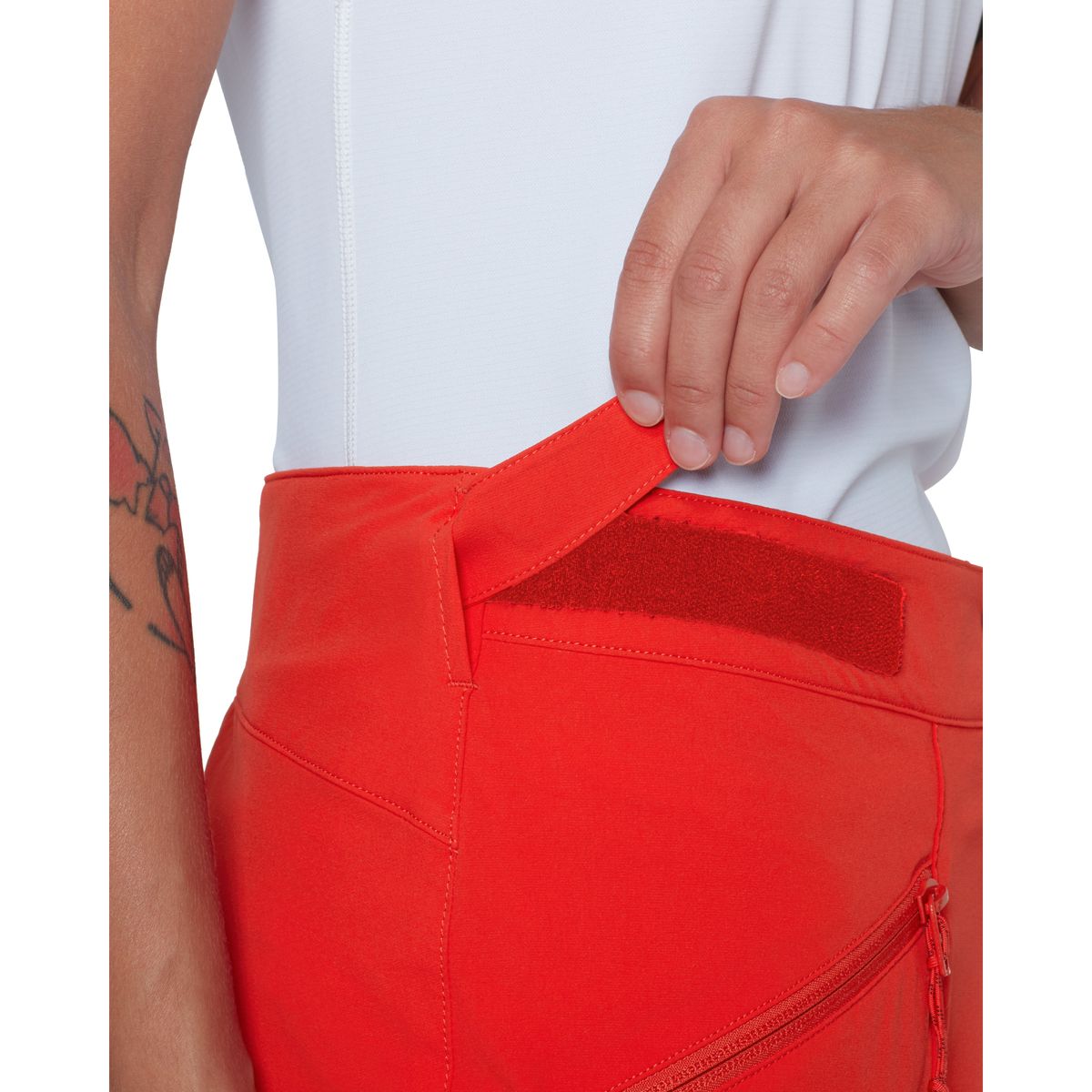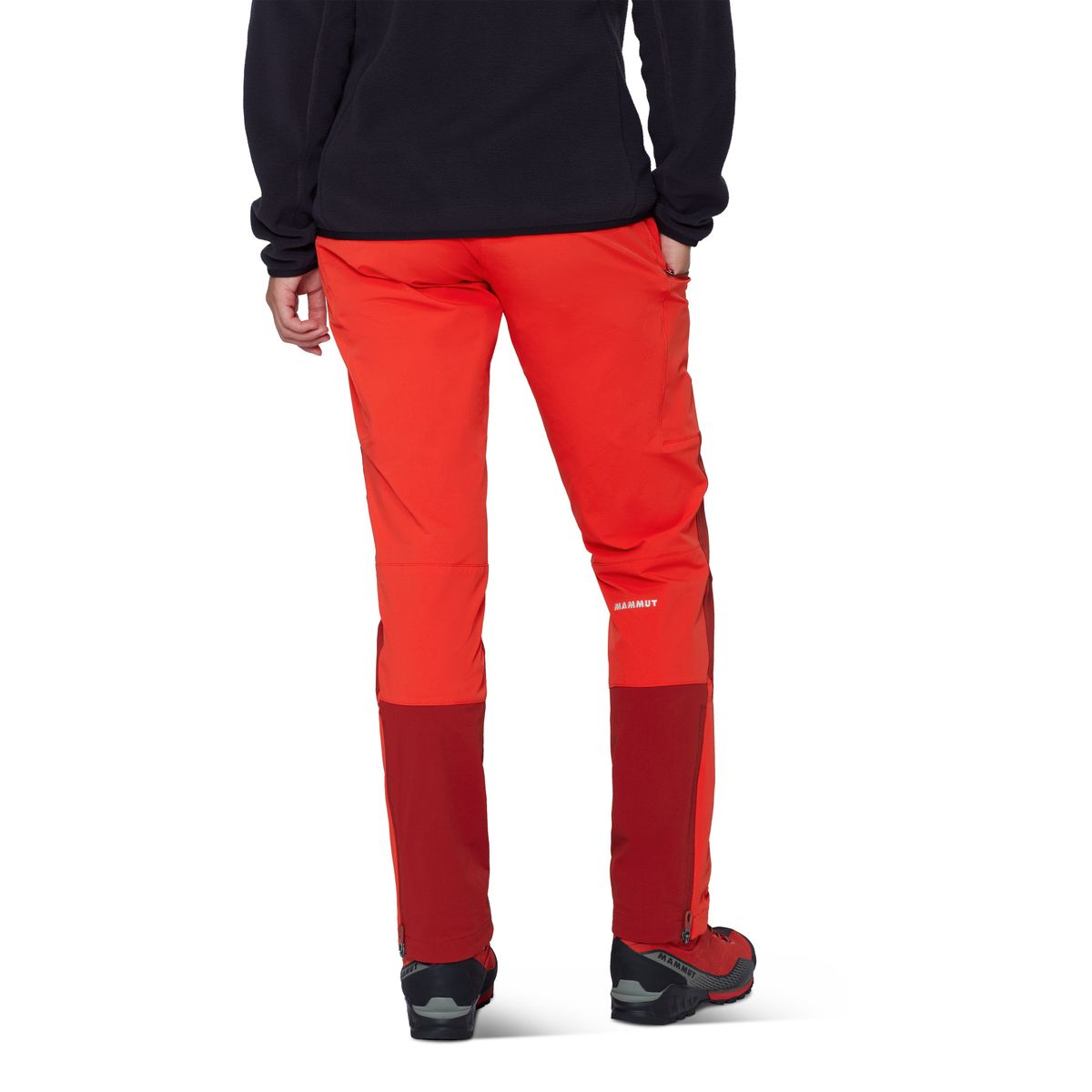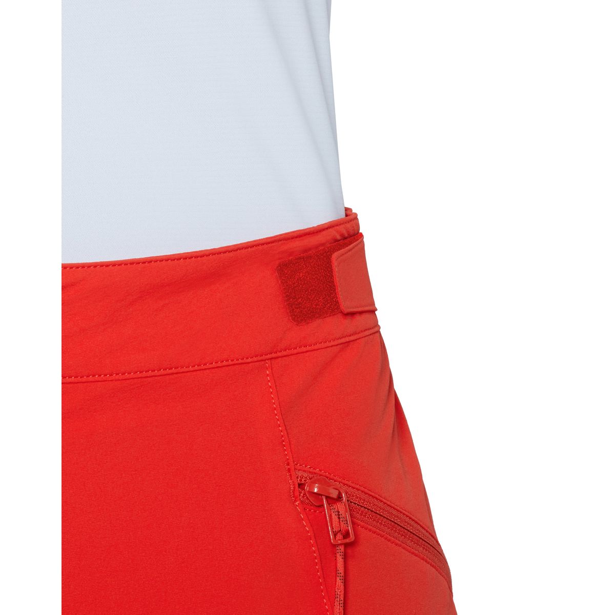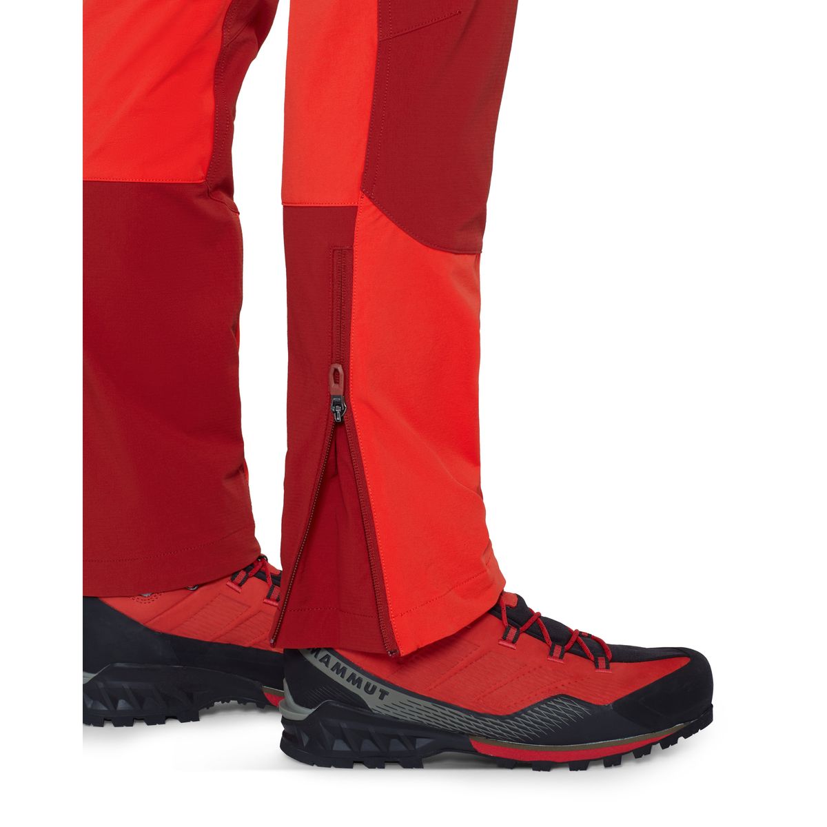 Für Komfort und Einsatz am Berg sorgen Zwickeleinsatz im Schritt, Beinabschluss mit Zwickel und Reißverschluss, asymmetrisch geformter Saum für bessere Passform über Bergschuhen sowie ein verstaubarer Befestigungshaken. Die Beintasche ist klettergurtkompatibel.