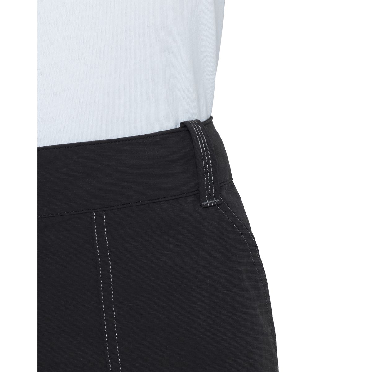 Der Bund ist hinten elastisch und lässt sich innen über eine Bundkordel feinjustieren, Gürtelschlaufen ermöglichen zusätzlich die klassische Fixierung. Die Saumweite kannst du über einen inneren Kordelzug regulieren, damit nichts beim Klettern stört.