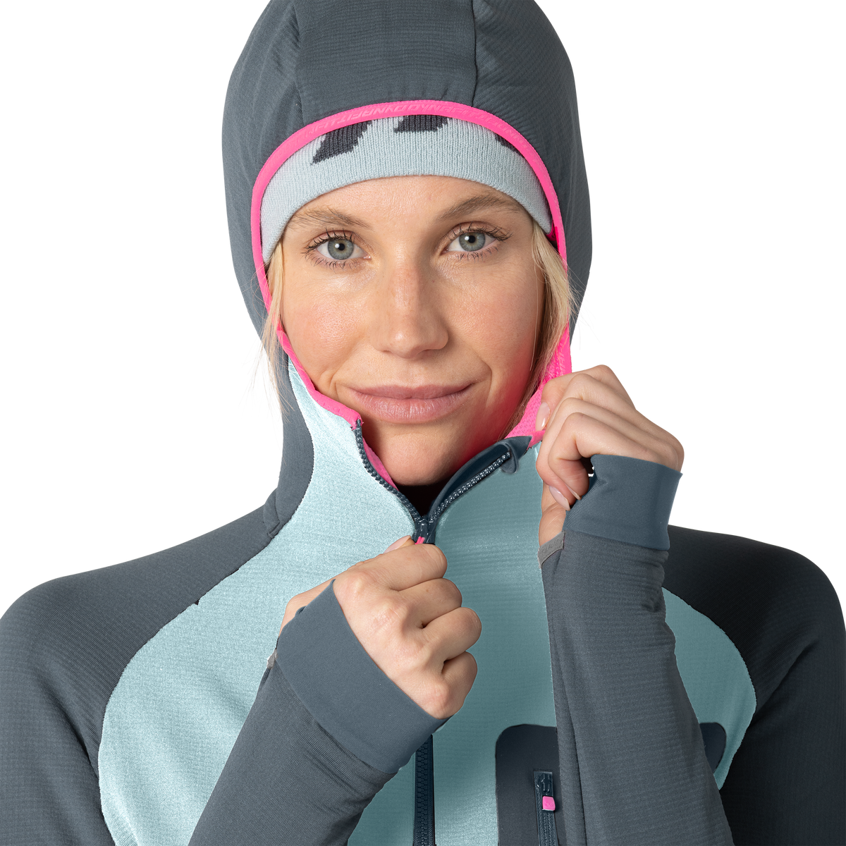Die Radical Polartec® Kapuzenjacke für Damen ist ein leichtes und technisches Fleece, das sich ideal als Midlayer für Skitouren und den Alltag eignet. Mit ihrem sportlichen Look und der athletischen Passform ist sie sowohl auf dem Berg als auch abseits des Schnees ein gemütlicher Begleiter.