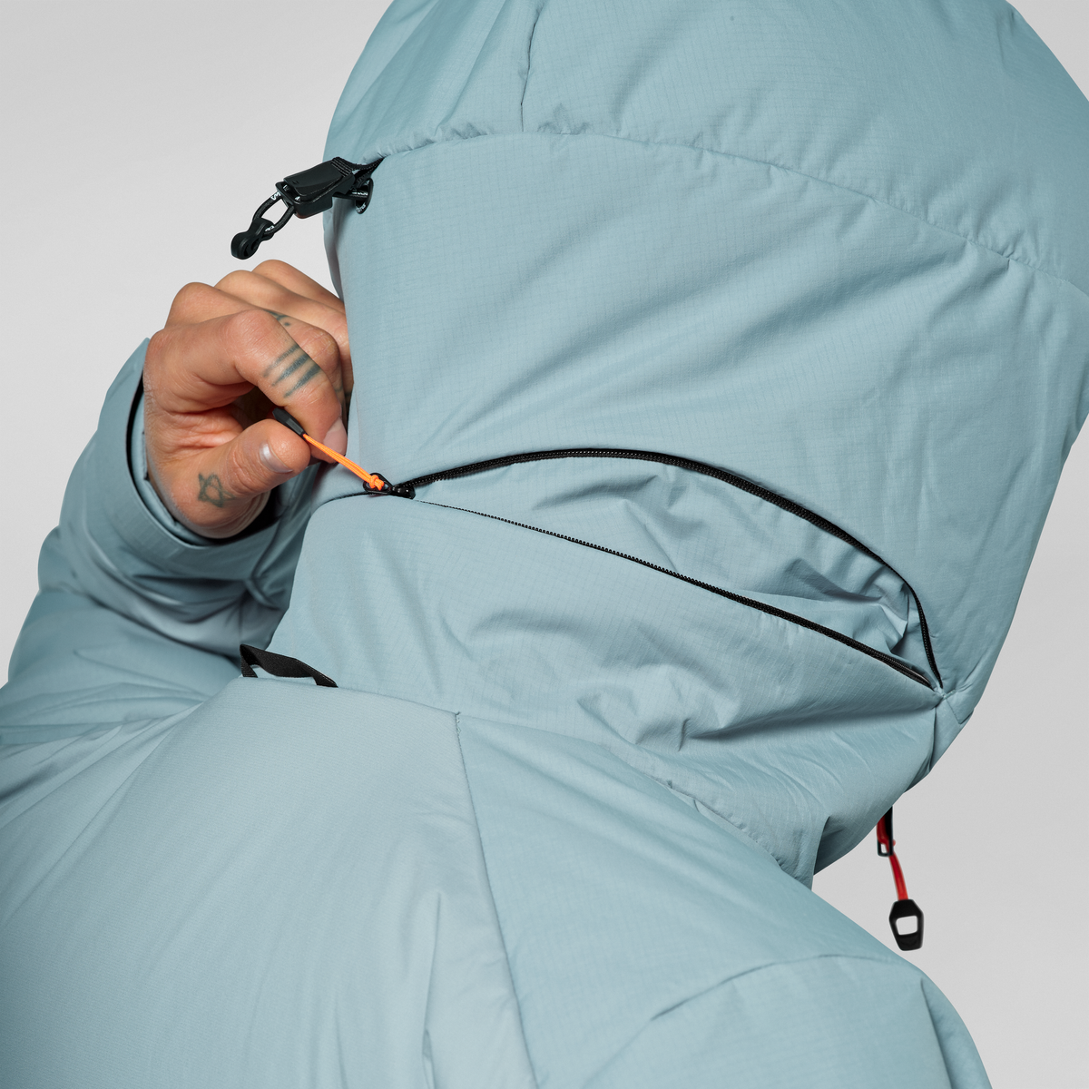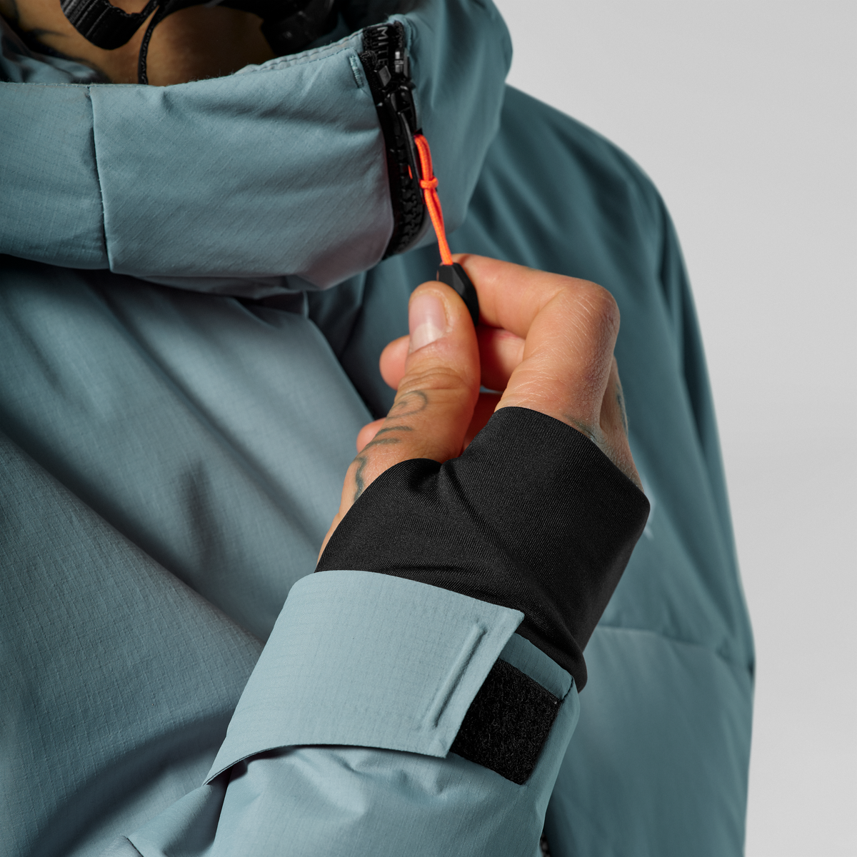 Weitere Features sind zwei Eingrifftaschen mit Reißverschluss, eine zusätzliche Brusttasche, sowie zwei offene Mesh-Innentaschen für Kleinteile. Der verstellbare Saum schließt Zugluft aus, während der Reißverschlusszwickel an der Kapuze ein halbmondförmiges Visier formt.
