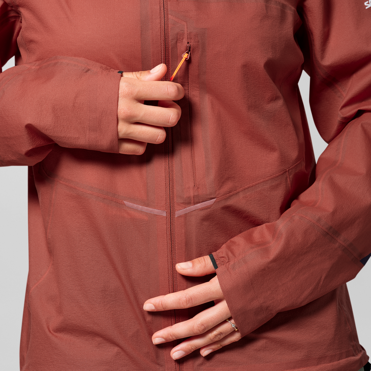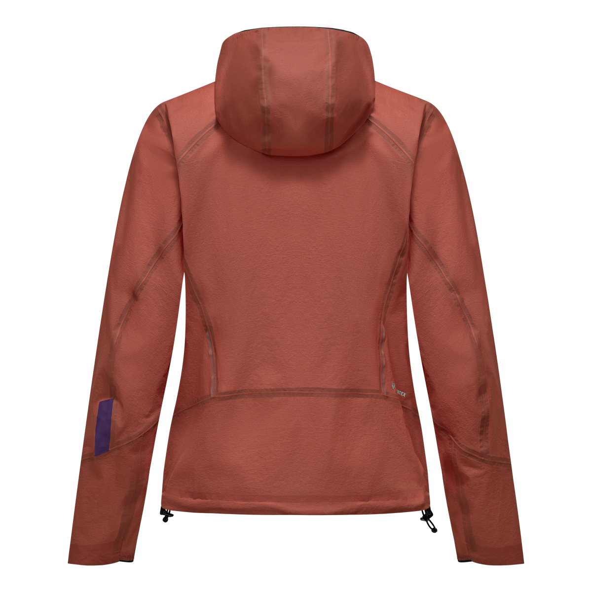- Wasser- und winddichte sowie atmungsaktive 2,5-Lagen-Jacke für Damen zum Speed Hiking mit vollständig verschweißten Nähten, Sturmkapuze und Brusttasche, in der sich die Jacke verstauen lässt
