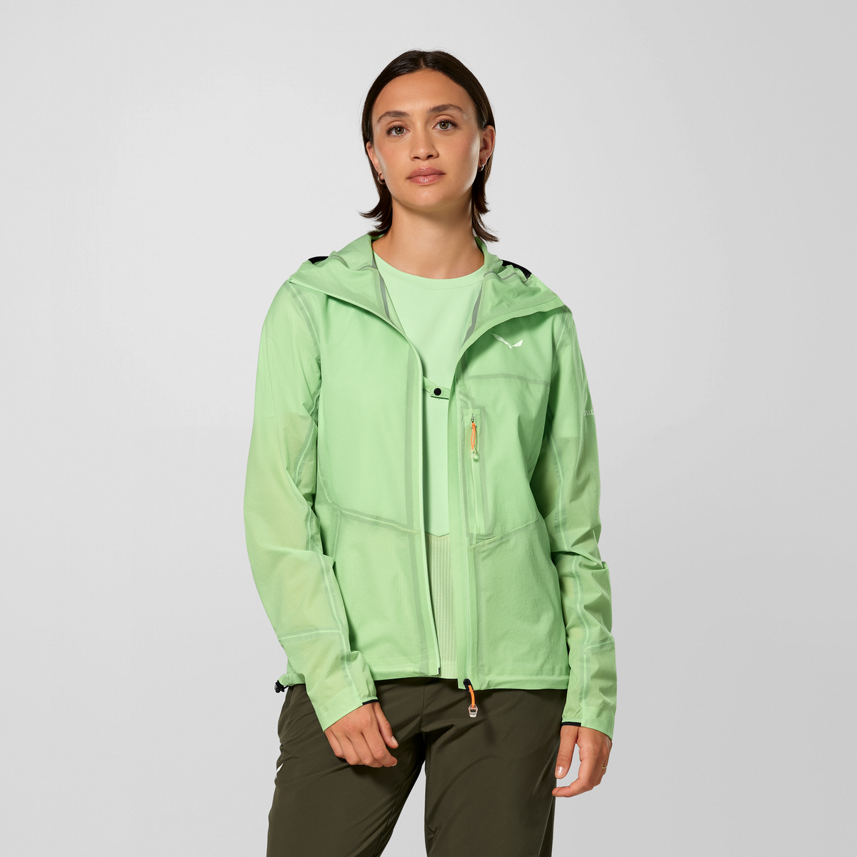 - Wasser- und winddichte sowie atmungsaktive 2,5-Lagen-Jacke für Damen zum Speed Hiking mit vollständig verschweißten Nähten, Sturmkapuze und Brusttasche, in der sich die Jacke verstauen lässt