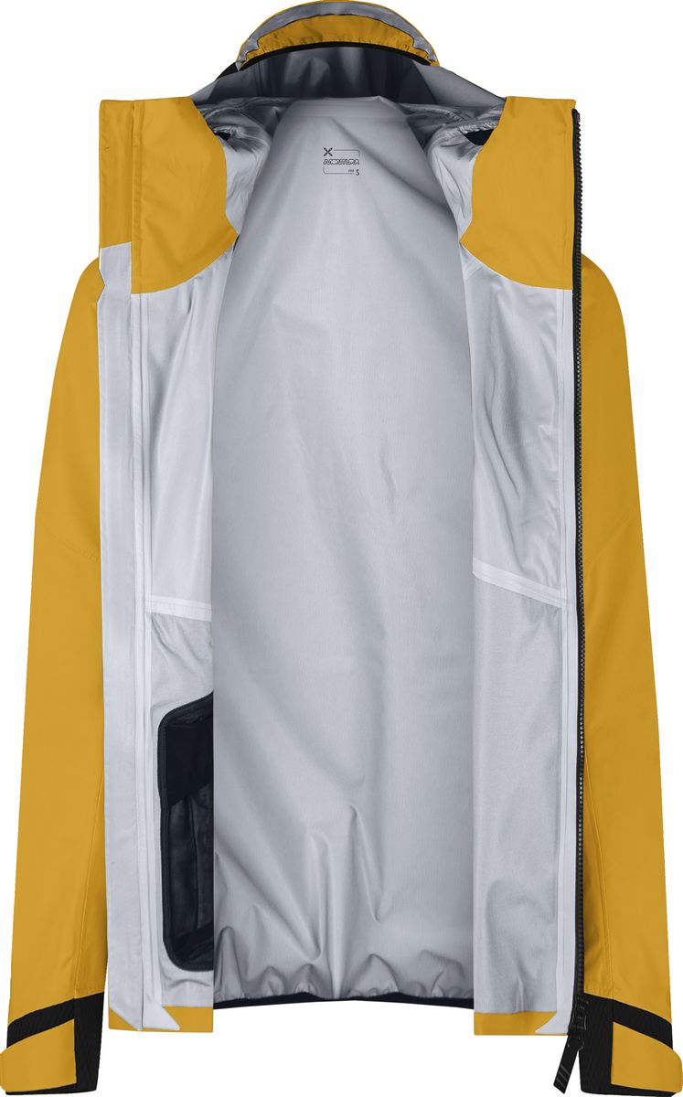 Die Jacke besteht aus einem 3-lagigen, recycelten PROMETEO-Nylon mit natürlichem Weft-Stretch. Die Konstruktion kombiniert eine ultraleichte Membran mit einem feinen Nylon-Innenfutter, sorgt für eine Wassersäule von 20.000 mm und eine hohe Atmungsaktivität (ca. 30.000 g/m²/24h).
