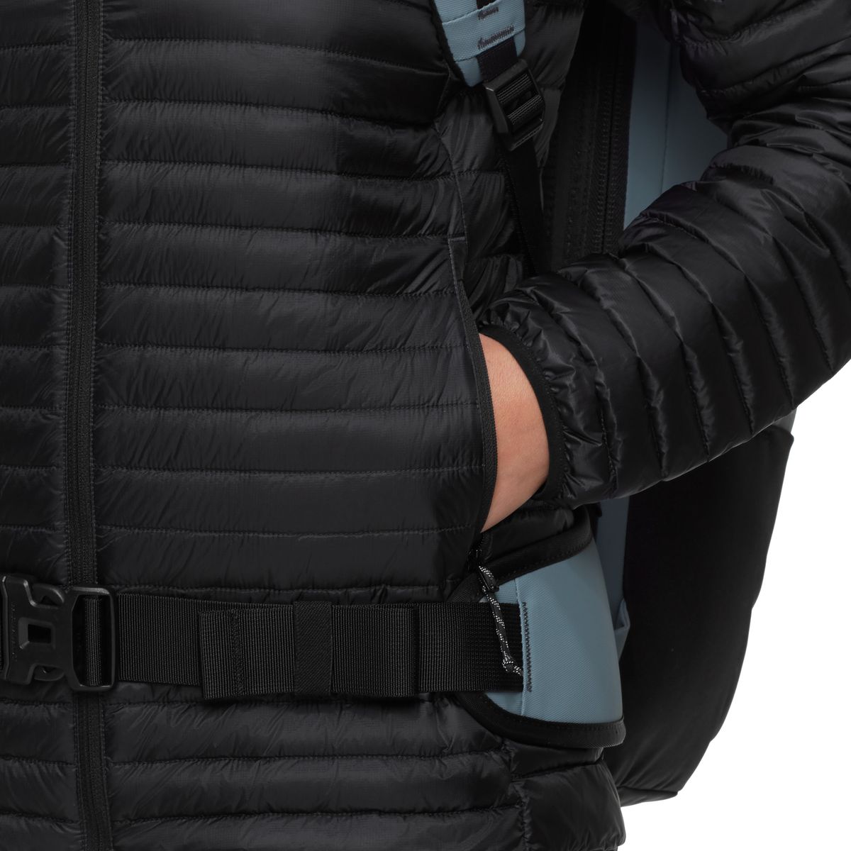 Das geringe Packvolumen erlaubt es, die Jacke in der rechten Fronttasche zu verstauen. Zwei rucksack-kompatible Seitentaschen mit Reissverschluss, ein elastischer Saum sowie Armabschlüsse und eine vorgeformte, kompakte Kapuze sorgen für durchdachte Funktionalität unterwegs.