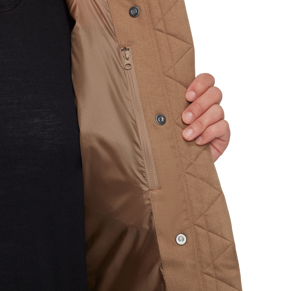 Eine breite Patte mit verdeckten Druckknöpfen verbessert den Wetterschutz entlang der Reißverschlussvorderseite und macht die Jacke alltagstauglich für urbane Tage und anspruchsvolle Touren.
