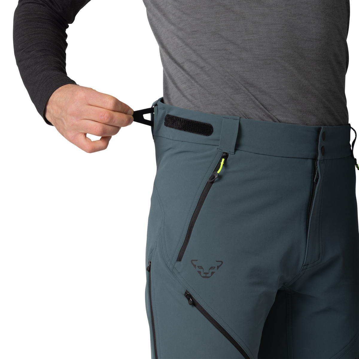 Für einen guten Sitz der Skitourenhose kannst Du sie mit dem verstellbaren Bund regulieren und, wenn Du möchtest, Träger anbringen. Auch den skischuhkompatiblen Saum kannst Du individuell einstellen. Er ist sogar mit einem praktischen Kantenschutz versehen. Zwei seitliche Reißverschlusstaschen sorgen für die sichere Unterbringung von Kleinigkeiten, die Du dabei hast.