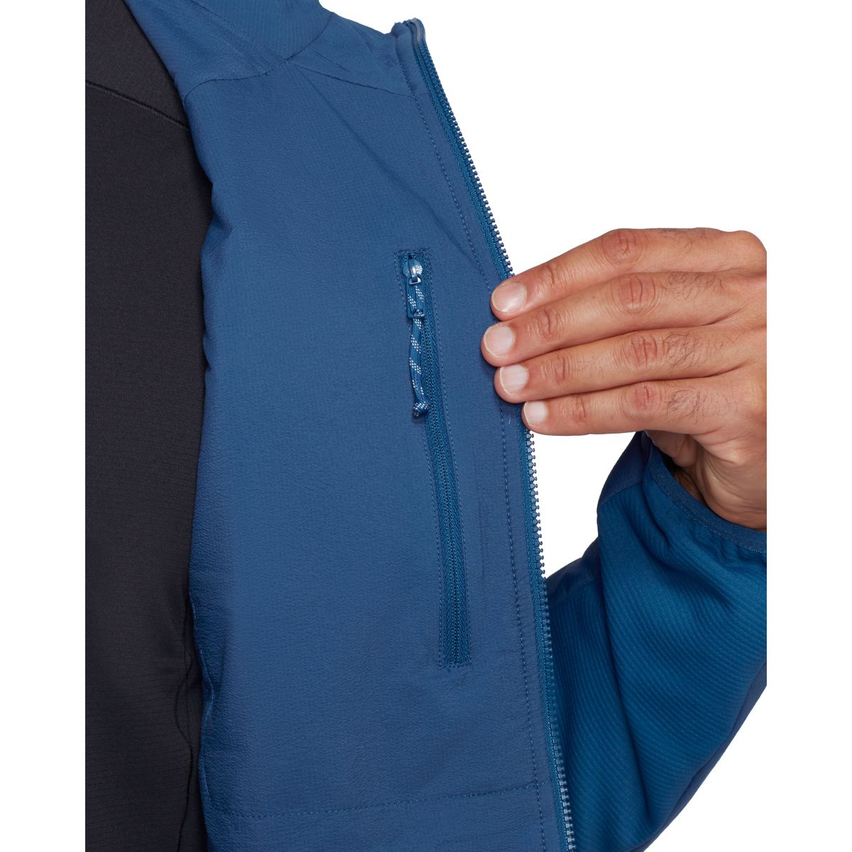 Die Jacke verfügt über zwei rucksackkompatible Seitentaschen mit Reißverschluss, eine Reißverschluss-Innentasche und elastische Abschlüsse an Saum und Armen für besseren Sitz. Die enganliegende Kapuze ist helmtauglich und kann unter einem Kletter- oder Skhelm getragen werden.
