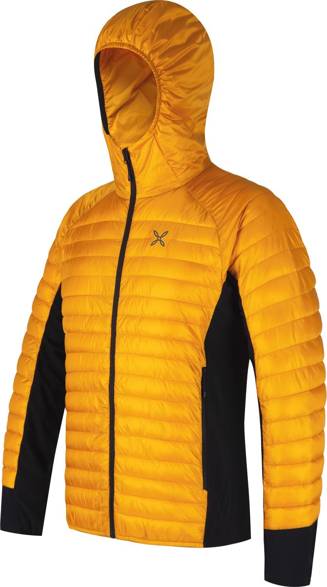 Wattierte Herrenjacke mit Kapuze, Pertex Quantum Nylon mit DWR, kontrastierendes Nylon-Stretch mit DWR, Nylonfutter, 100% recycelte Comfortemp-Füllung, 40 g synthetische Isolierung, Frontreißverschluss, Reißverschlusstaschen außen, offene Innentaschen, elastische Abschlüsse.