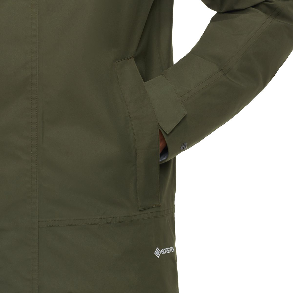 Das 2?lagige GORE?TEX?Aussenmaterial mit PFC?freier ePE?Membran hält Regen und Wind sicher ab; die DWR?Ausrüstung ist pfc?frei. Eine Klappe mit Druckknöpfen vor dem Frontreißverschluss und verstellbare Kapuzen? und Saumzüge erhöhen den Schutz bei stürmischem Wetter.