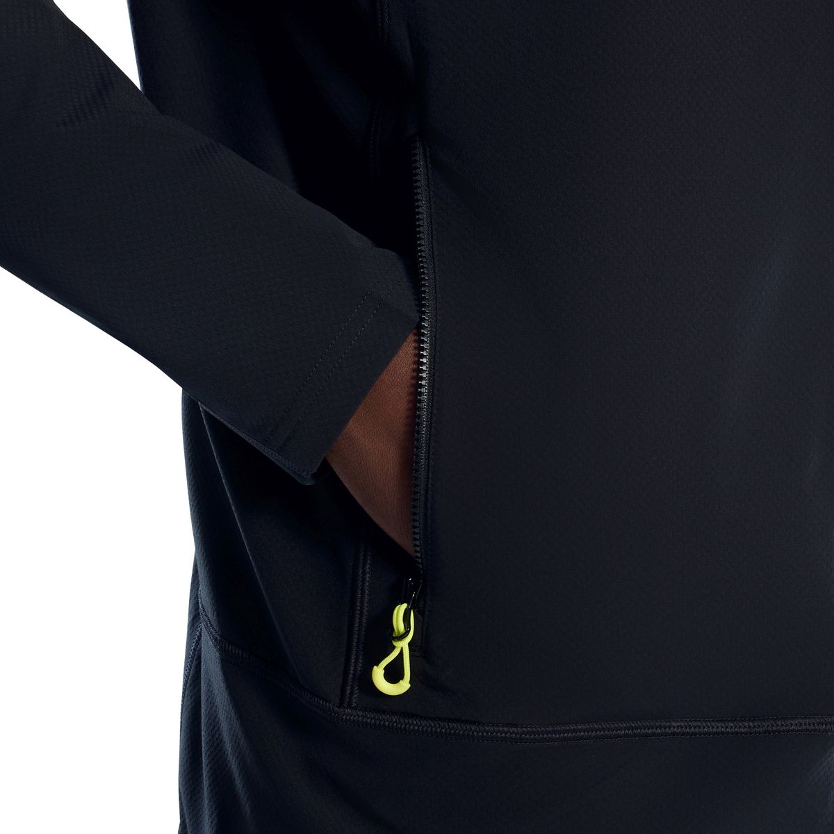 Die Jacke hat eine Regular-Fit-Passform, die Bewegungsfreiheit bietet ohne aufzutragen. Flache Nähte sorgen für ein angenehmes Hautgefühl und eine aufgeräumte Optik, während halb gerippte Ärmelbündchen den Sitz an den Armen verbessern.