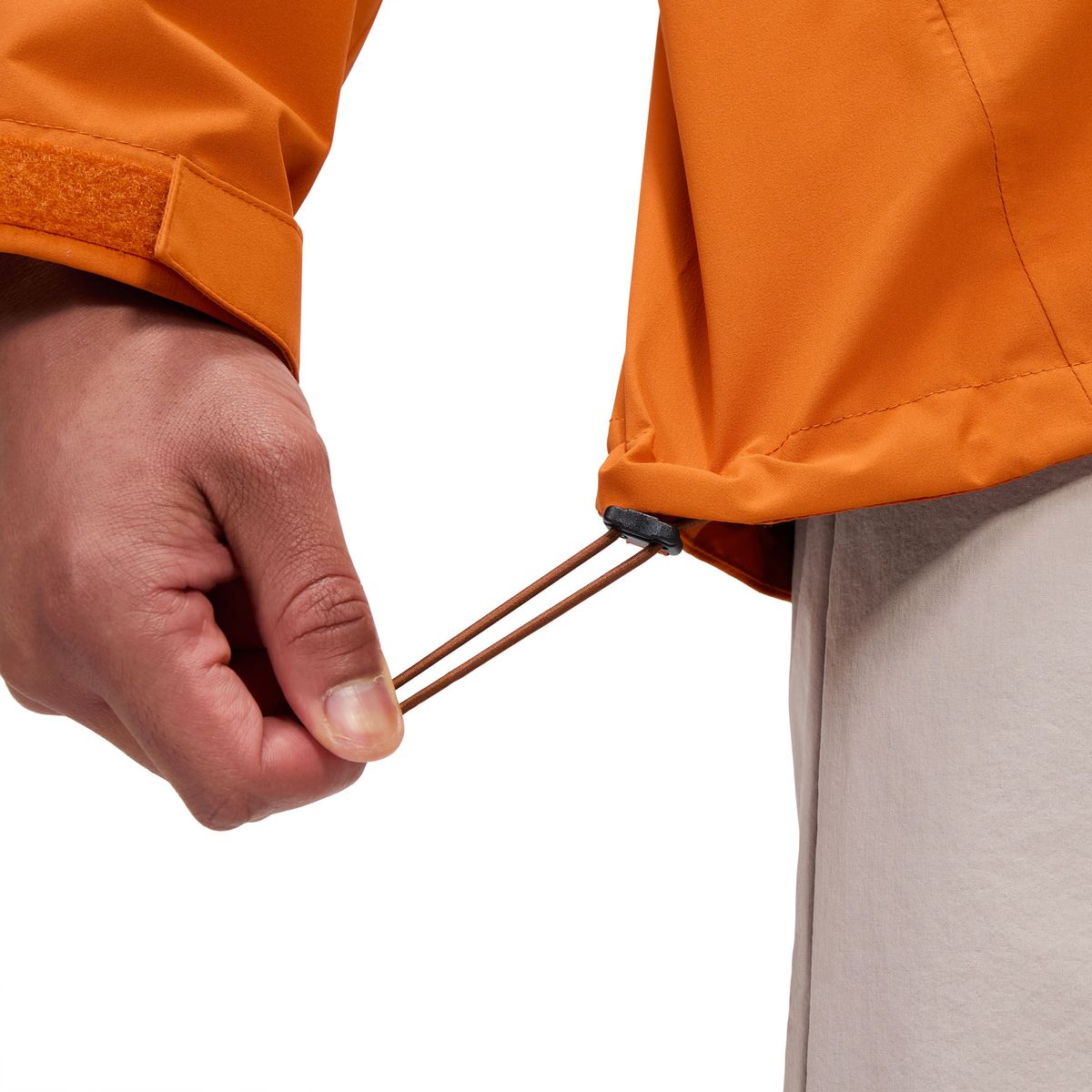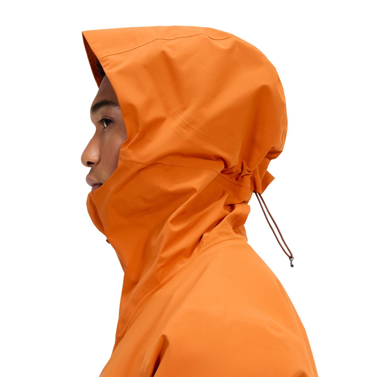 Die Jacke verfügt über einen wasserabweisenden, zentralen Frontreißverschluss mit einer innenliegenden Sturmklappe, die zusätzlichen Schutz vor den Elementen bietet. Zwei praktische Eingrifftaschen bieten Stauraum für kleine Gegenstände, während die einseitig verstellbare Kapuze für einen individuellen Sitz sorgt.
