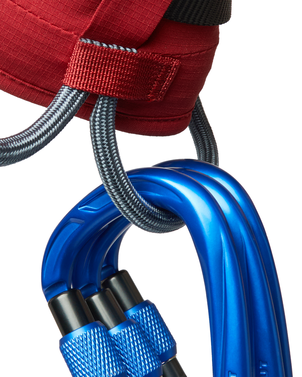 Du bekommst vier große, starre Textil-Materialschlaufen für Erst- und Zweitausrüstung sowie eine kleine, weichere Schlaufe für zusätzlichen Schnickschnack. Zwei Loops zur Fixierung von Eisschraubenkarabinern, eine Befestigung für Chalk-Bag und eine praktische Tasche für den einfachen Transport runden die Ausstattung ab.