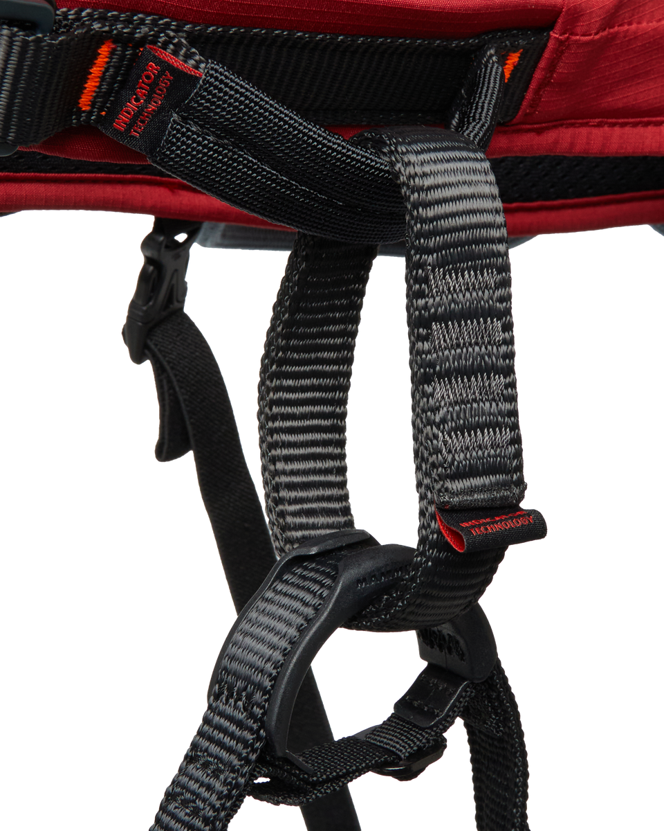 Die Split-Webbing-Technologie verteilt das Gewicht gleichmäßig über Taille und Beinschlaufen, reduziert Druckstellen und macht längere Hängestände angenehmer. Die frauenspezifische Geometrie mit verlängertem Beinschlaufensteg und breiteren Beinschlaufen bietet dir zusätzlichen Komfort, während verstellbare Beinschlaufen eine präzise Anpassung ermöglichen.