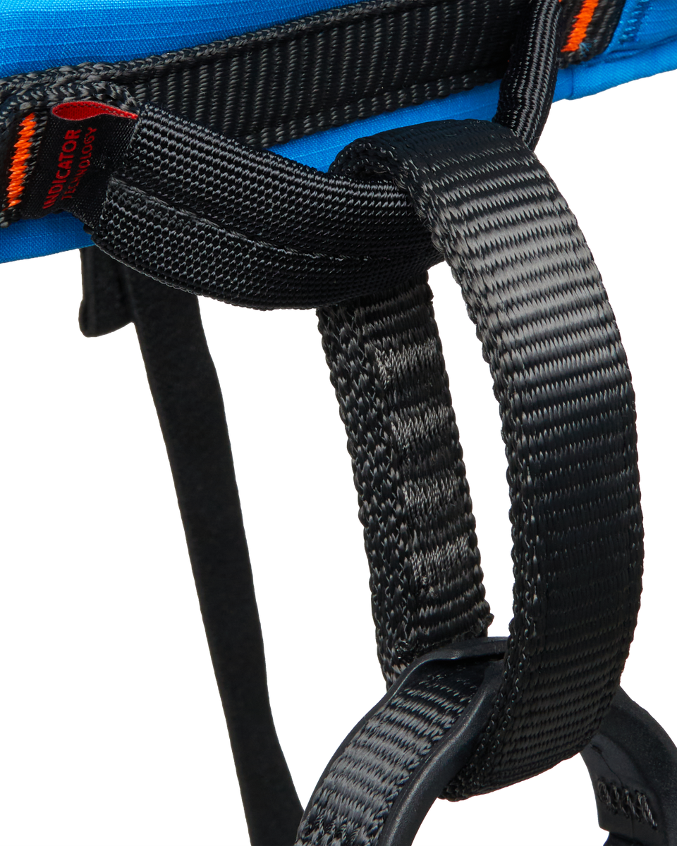 Der Gurt bietet zahlreiche Schutzmerkmale: Abriebschutz an der Einbindeschlaufe, Verschleißindikatoren an Hüft- und Beingurtösen sowie an der Einbindeschlaufe und eine hochwertig geschützte Einbindeschlaufe für längere Lebensdauer.
