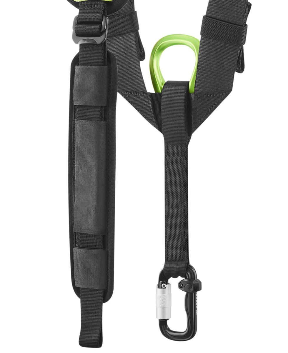Im Lieferumfang ist ein FORAS Karabiner zur Befestigung am Hüftgurt enthalten. Weitere Ausstattungsdetails sind die VCR/Klett-Schlaufen an den Schultern und die sternale Metall-Anseilöse nach EN 361.