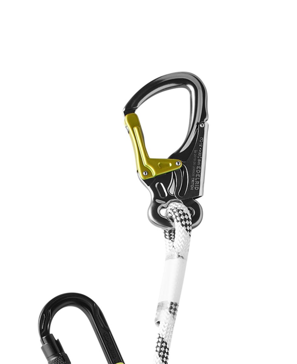 Die extrem robuste Kernmantelkonstruktion sorgt für hohe Langlebigkeit und Sicherheit im Einsatz. Das Ombilix 140 wird mit dem DSG TRITON Karabiner (intuitive Handballensicherung) und dem OVAL POWER 2500 Karabiner mit Triple-Verschluss zur Gurtbefestigung geliefert.