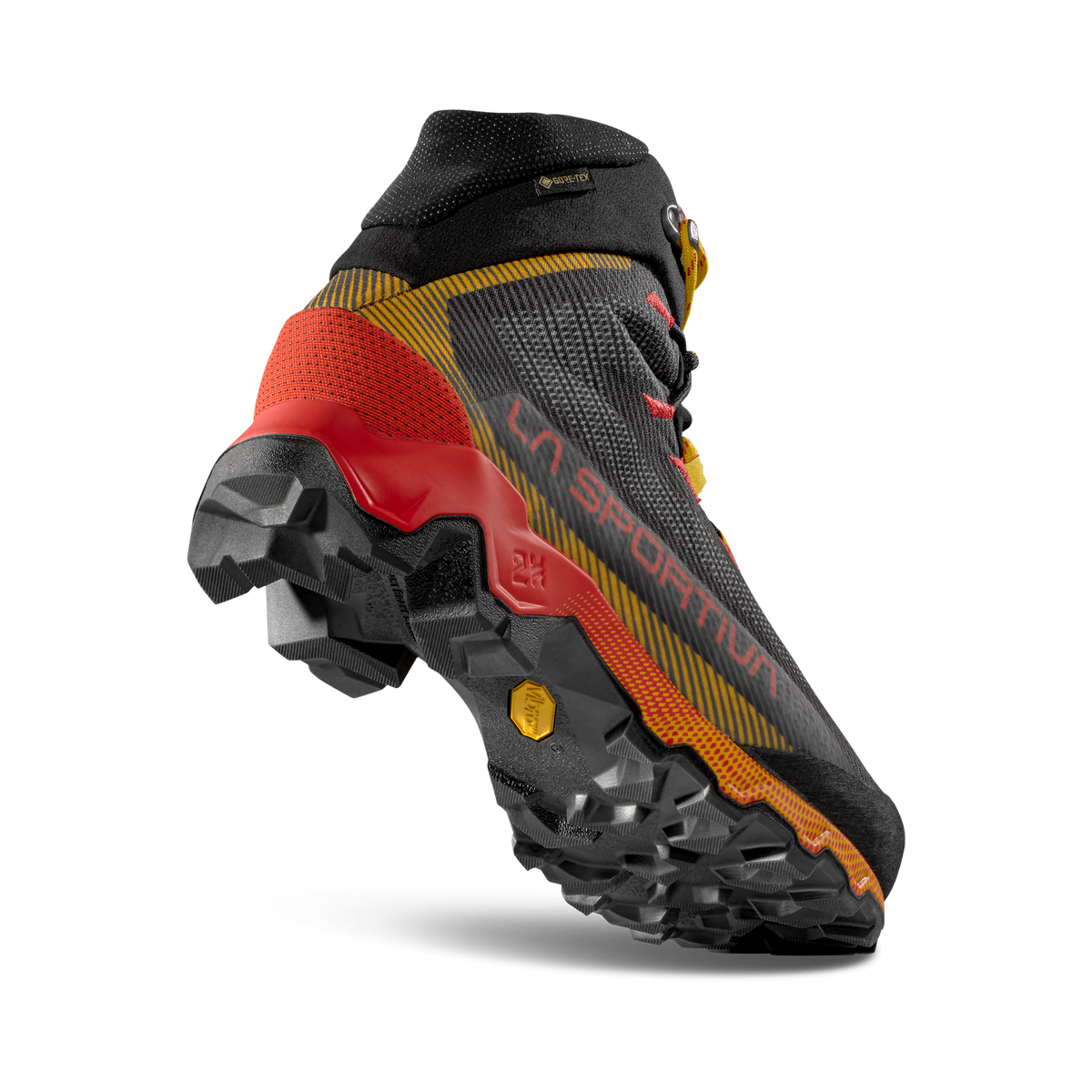 Außergewöhnliche Gehfähigkeit dank der innovativen Double Heel™ Fersenkonstruktion: die Geometrie mit sehr ausgeprägten doppelten hinteren Stollen erhöht die Bremswirkung beim Abstieg, ermöglicht ein sanfteres Abrollen und reduziert die Ermüdung der Muskelermüdung