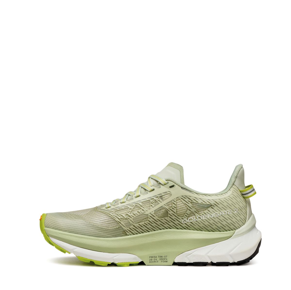 Der Golden Gate 2 Wmn ist in den Größen 36 bis 43 erhältlich und berücksichtigt dabei auch Zwischengrößen, um die perfekte Passform zu gewährleisten. Das Außenmaterial besteht aus einer hochwertigen Kombination von Mesh und Mikrofaser, die durch wasserbasierten PU Druck verstärkt wird. Das Stretch Textile Futter sorgt für ein angenehmes Tragegefühl bei jeder Bewegung. Die innovative Presa® TRN-07 / ATR Gum Sohle zeichnet sich durch ihre Haltbarkeit und Griffstärke aus. Die Sprengung von 4 mm unterstützt eine natürliche Fußstellung und Bewegungsabläufe, während das Gewicht von 235 g (Größe 38) die Leichtigkeit des Laufschuhs unterstreicht. Hergestellt wird der Golden Gate 2 in Vietnam.