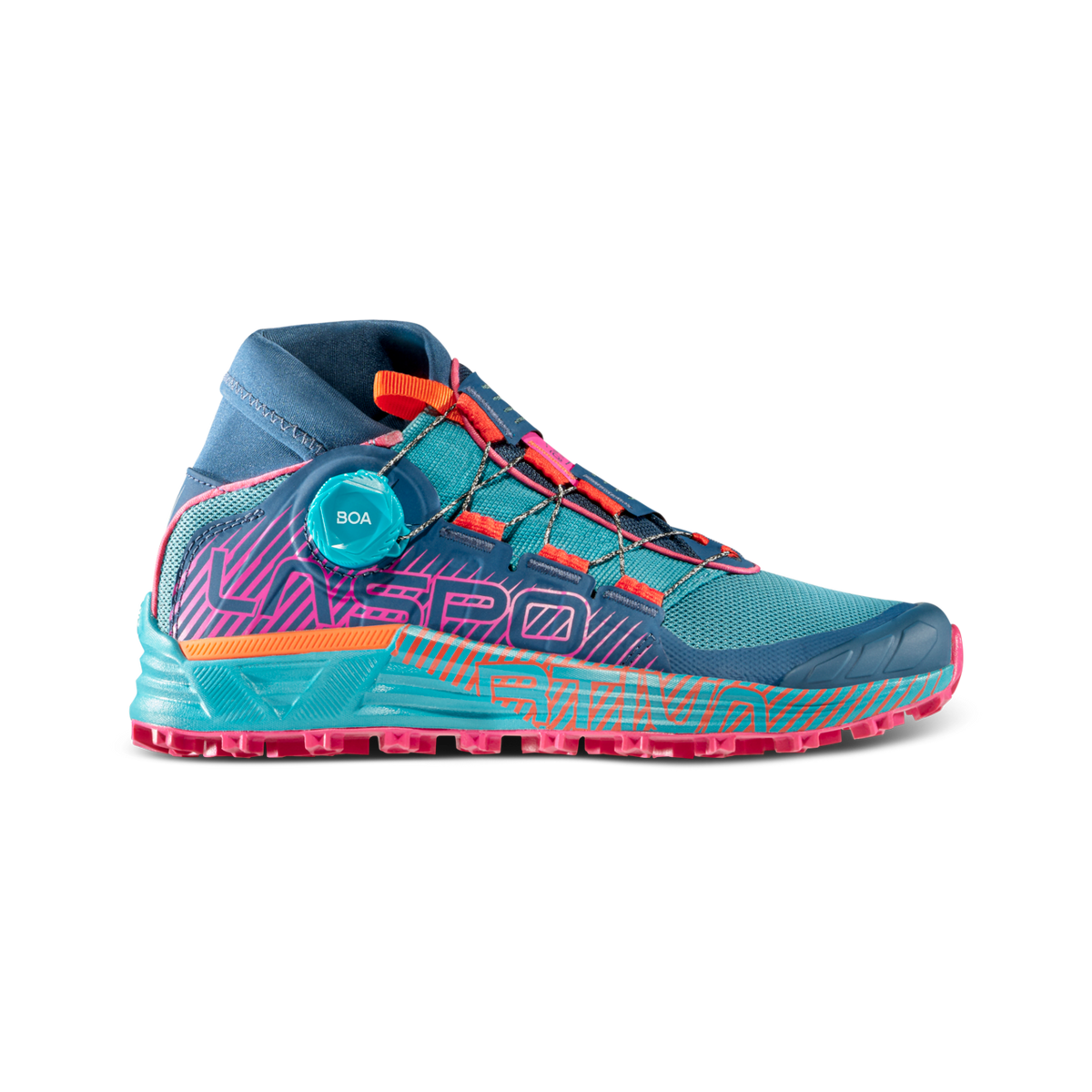 Der Cyklon Woman ist ein leistungsorientierter Trailrunning-Schuh, konzipiert für Skyraces und technische Geländeläufe über mittlere Distanzen. Er vereint präzise Kontrolle bergab mit ausreichend Schutz und Komfort für schnelle, anspruchsvolle Einsätze im alpinen Gelände.