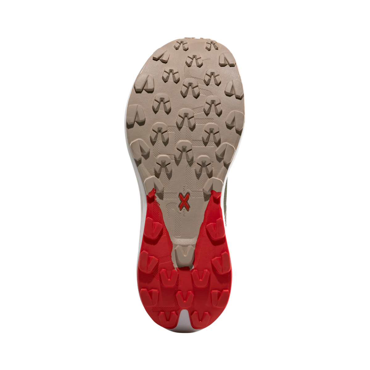 Die bi-komponentige FriXion Red Außensohle kombiniert langlebige Gummizonen in der Ferse mit besonders griffigen Bereichen im Mittelfuß und Vorfuß. Die große Auflagefläche und der mittlere Rocker erhöhen die Stabilität bei langen Abstiegen und technischen Passagen.