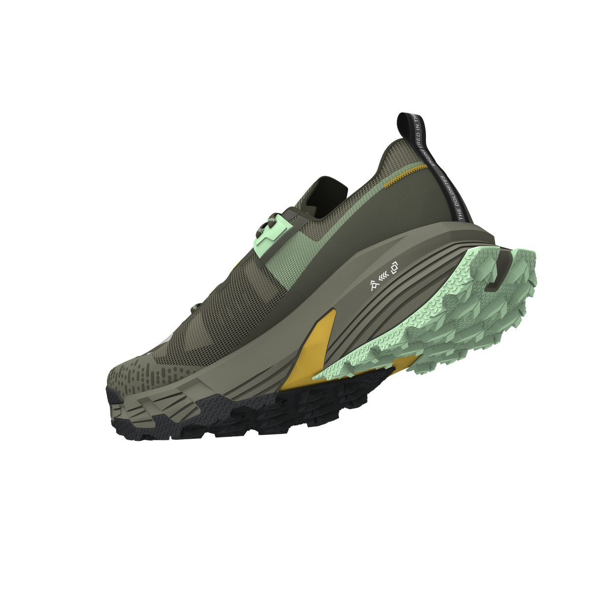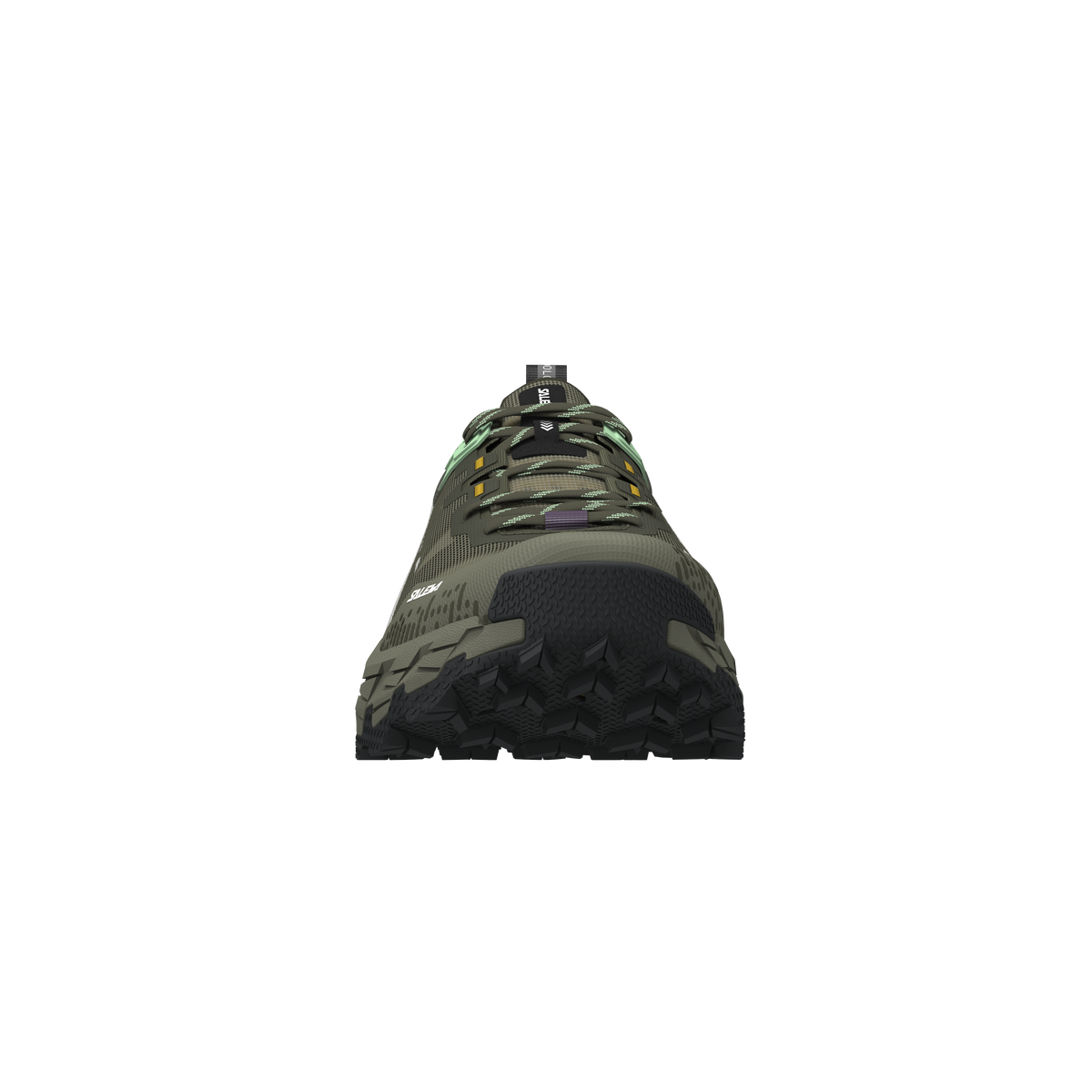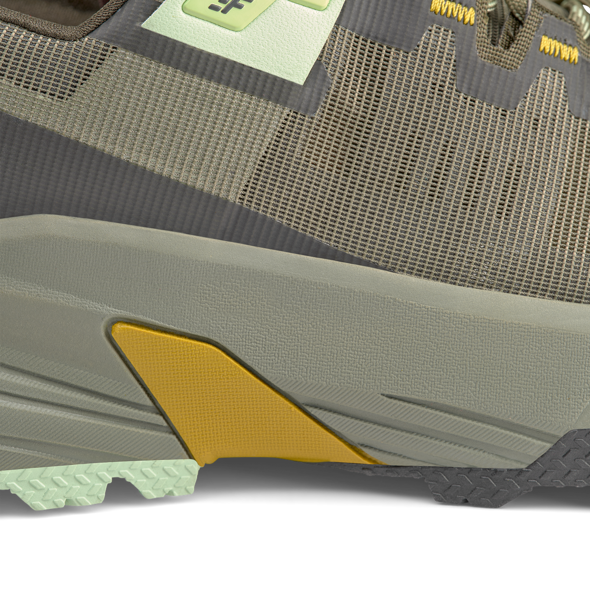 Das Obermaterial besteht aus einem hochfesten TPU-Film, atmungsaktivem Mesh und Mikrofaser, ergänzt durch das 3F-System aus TPU und PA für eine präzise Fersenführung. Ein zusätzlicher TPU-Folienschutz schützt sensible Zonen vor Abrieb und Steinen, ohne die Belüftung zu beeinträchtigen.