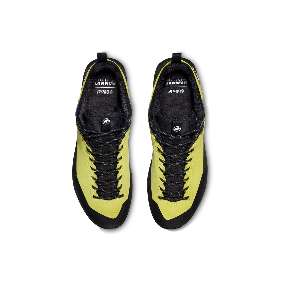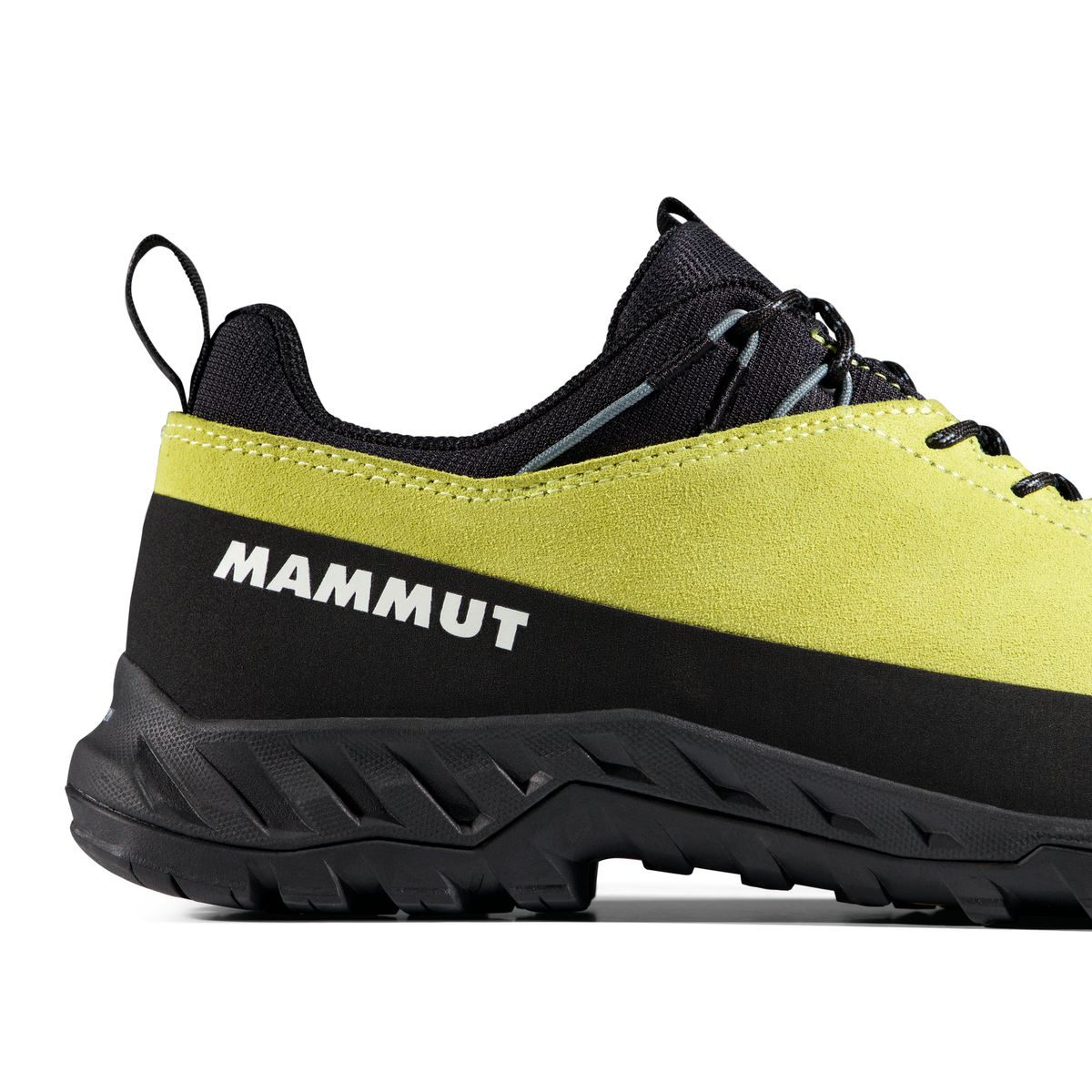 Das Obermaterial besteht aus strapazierfähigem Veloursleder, nachhaltig in Italien gegerbt (Mastrotto), und sorgt für Atmungsaktivität sowie Langlebigkeit. Mammut setzt auf PFC-freie DWR-Imprägnierungen, um umweltbelastende perfluorierte Chemikalien zu vermeiden.