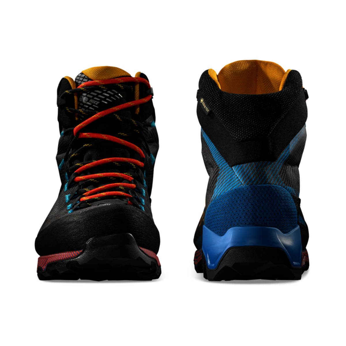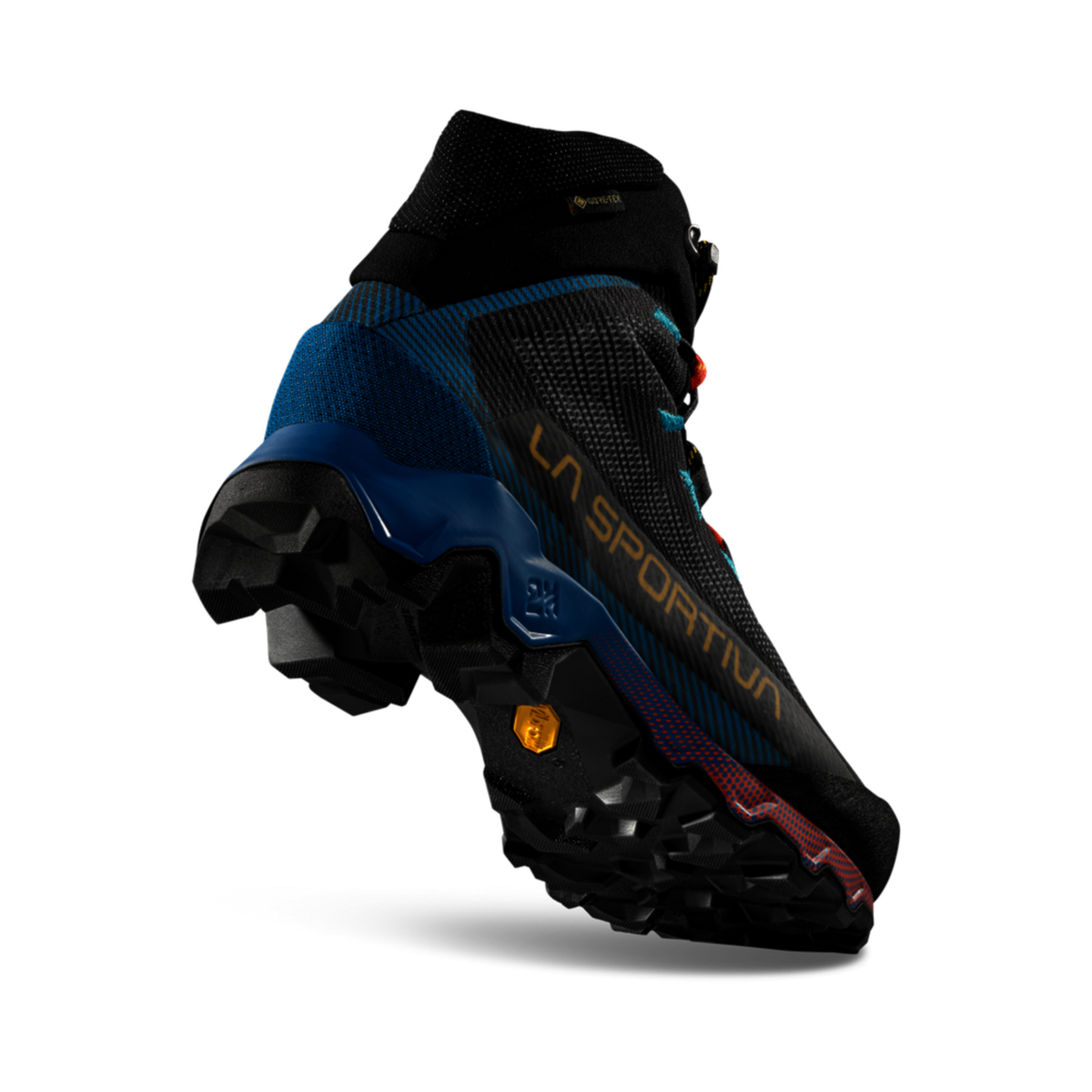 La Sportiva setzt auf nachhaltige Details: 100 % recycelte Schnürsenkel, Bluesign-GORE-TEX-Futter und eine Einlegesohle mit recycelten Anteilen. Zudem ist der Schuh PFAS-frei und vegan hergestellt.
